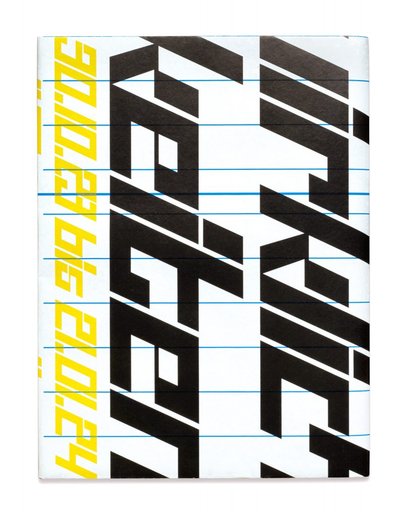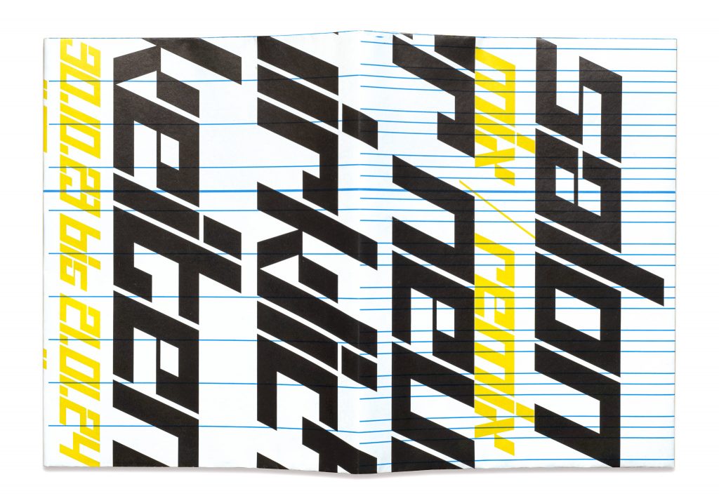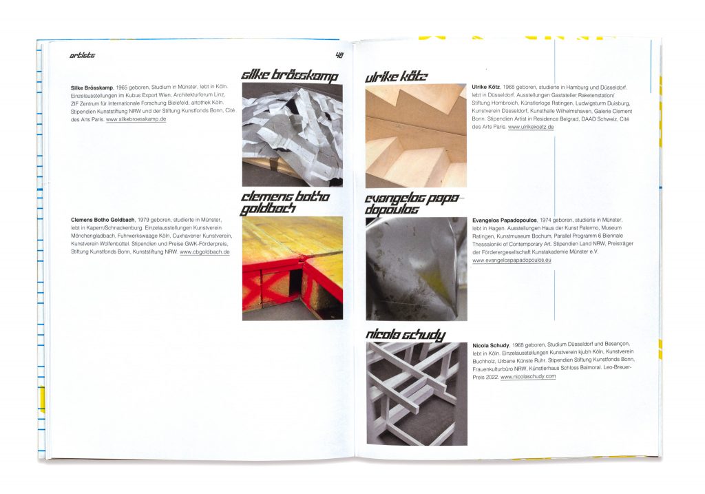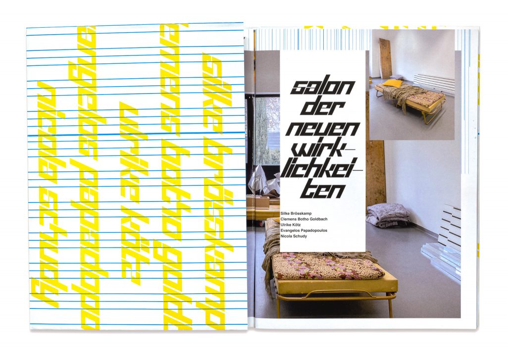 Die Künstlerin Nicola Schudy hat Künstlerkolleg*innen eingeladen gemeinsam ein sich veränderndes Werk zu schaffen. Der Ausstellungskatalog zu diesem Salon der Wirklichkeiten dokumentiert das Projekt in Etappen und wird eingefaltet in das Plakat zur Ausstellung. Typografie Uma Grotrian-Steinweg